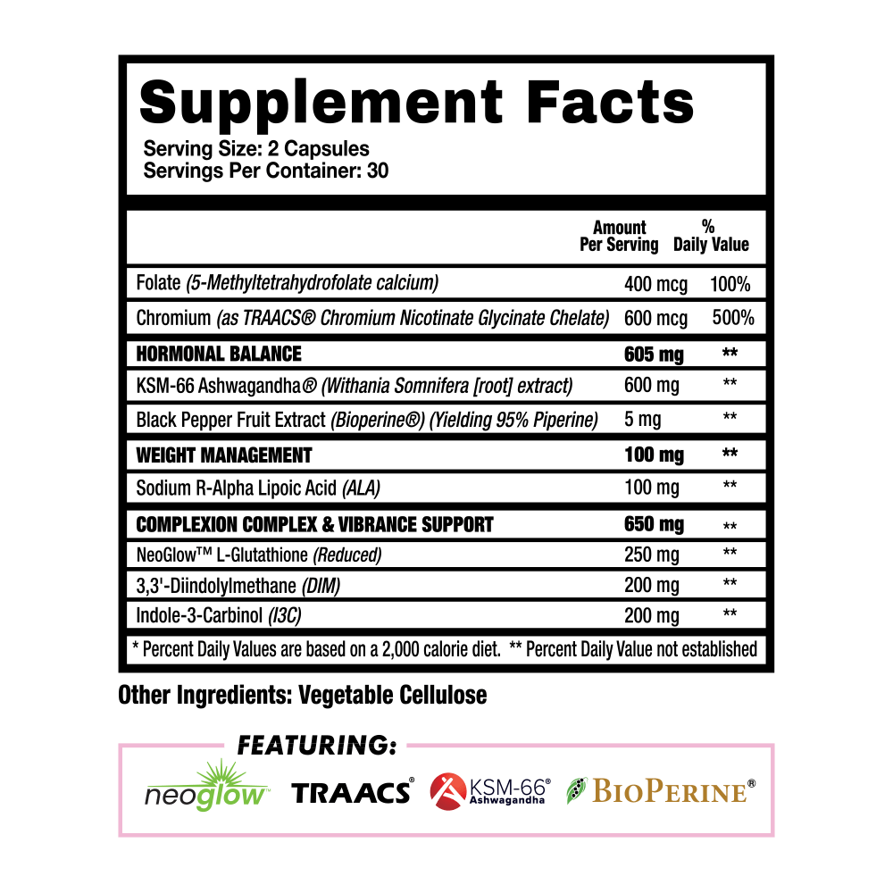 Vibrance is a female balance supplement formulated to support hormonal balance, stress levels, weight management and a vibrant complexion.*