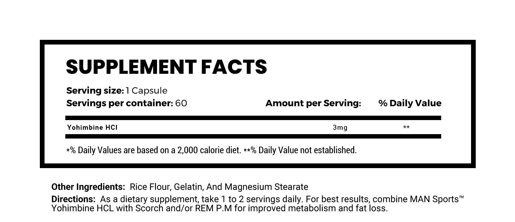 Yohimbine HCI from MAN Sports is the standardized, concentrated version of the principal active alkaloid found in the herb Pausinystalia Yohimbe. Don’t confuse MAN Sports real, high-grade Yohimbine HCl, with other less powerful, less purified or less concentrated forms of this herbal extract – which can contain up to 1,000 times less active alkaloid! MAN Sports Yohimbine HCl offers 3mg of 100% pure Yohimbine HCl per capsule. Achieve that peeled physique by tapping into fat stores and unlocking your full thermogenic potential.